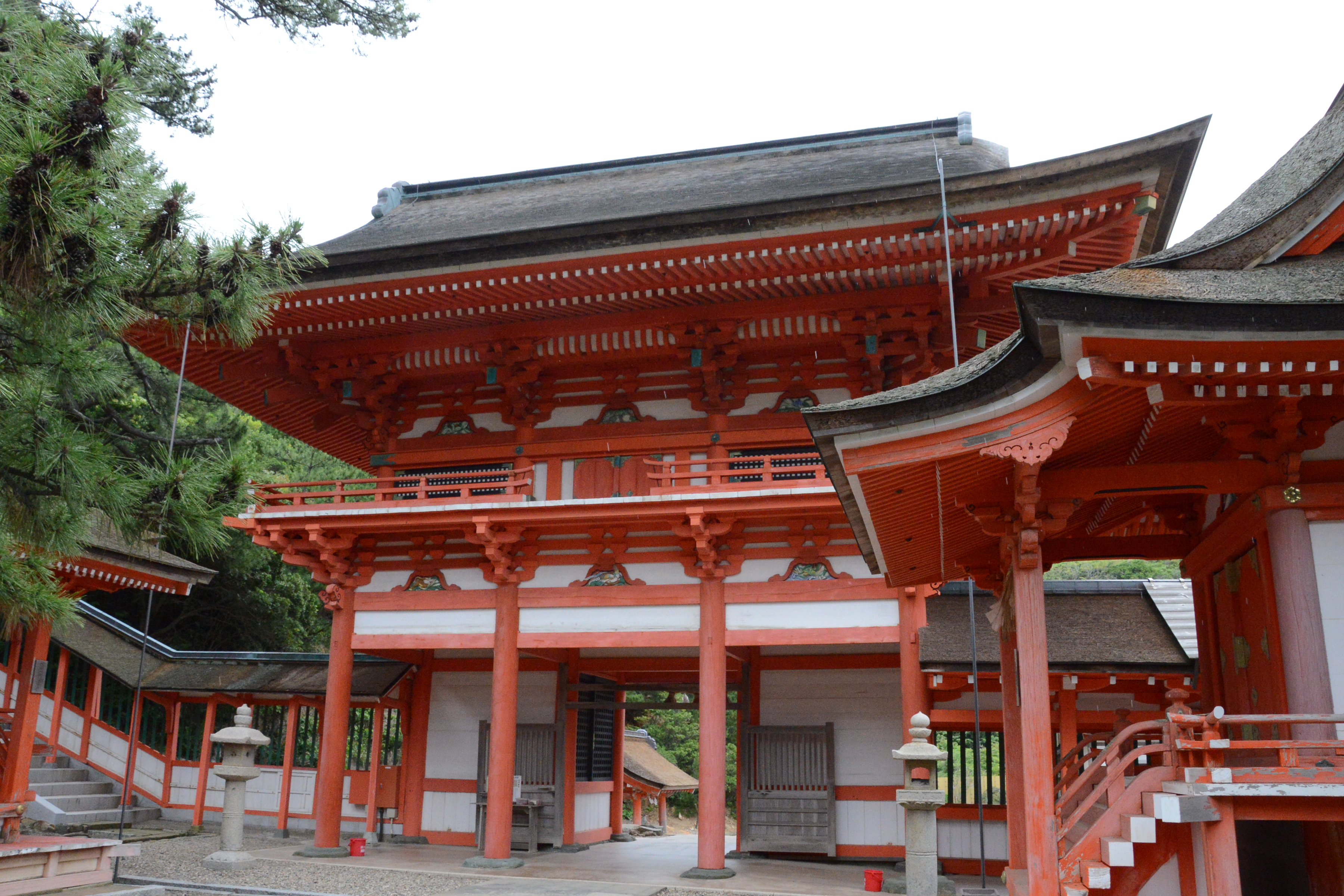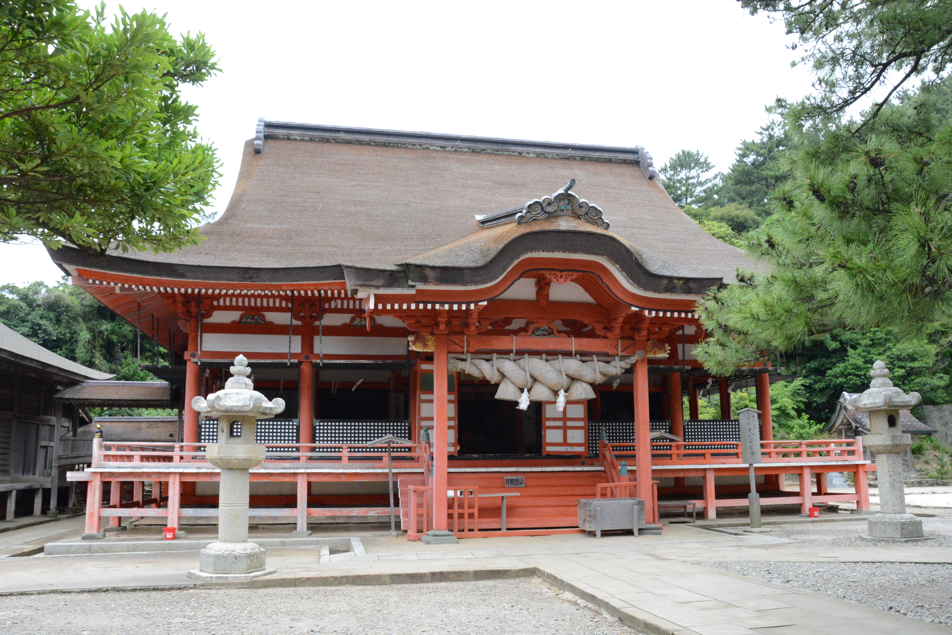 本社(日沈の宮・ひしずみのみや)は天暦2年(948年)に村上天皇の勅命により祀られ、上の本社(神の宮)は安寧天皇13年(紀元前536年)、勅命により祀られ、総称して日御碕大神宮とされました。 花崗岩の鳥居をくぐり、楼門を入った正面にあるのが下の宮で、上の宮は右手の小高いところに建っています。両社とも平入り拝殿と本殿が続いた権現造りで、楼門や回廊を含めたすべてが国の重要文化財にしてされています。 現在の社殿は、3代将軍・徳川家光の命により、幕府直轄工事として日光東照宮完成直後の寛永十一年(1634年)に、松江城主であった京極忠高(きょうごく ただたか)が着工し、忠高の死後は松江松平家の初代直政(なおまさ)が引き継ぎ十年を掛けて、寛永二十一年(1644年)に完成した桃山時代の代表的な遺構です。 両本殿の内部の天井と壁は、狩野・土佐派の画家により装飾されています。 社宝のうち、源頼朝が寄進したと伝えられる『白糸威鎧兜(しらいとよろいかぶと)』は国宝に、南北朝時代の武将であった名和長年が寄進したとされる『藍革威腹巻(あいかわおどしはらまき)』は国の重要文化財に指定されています。