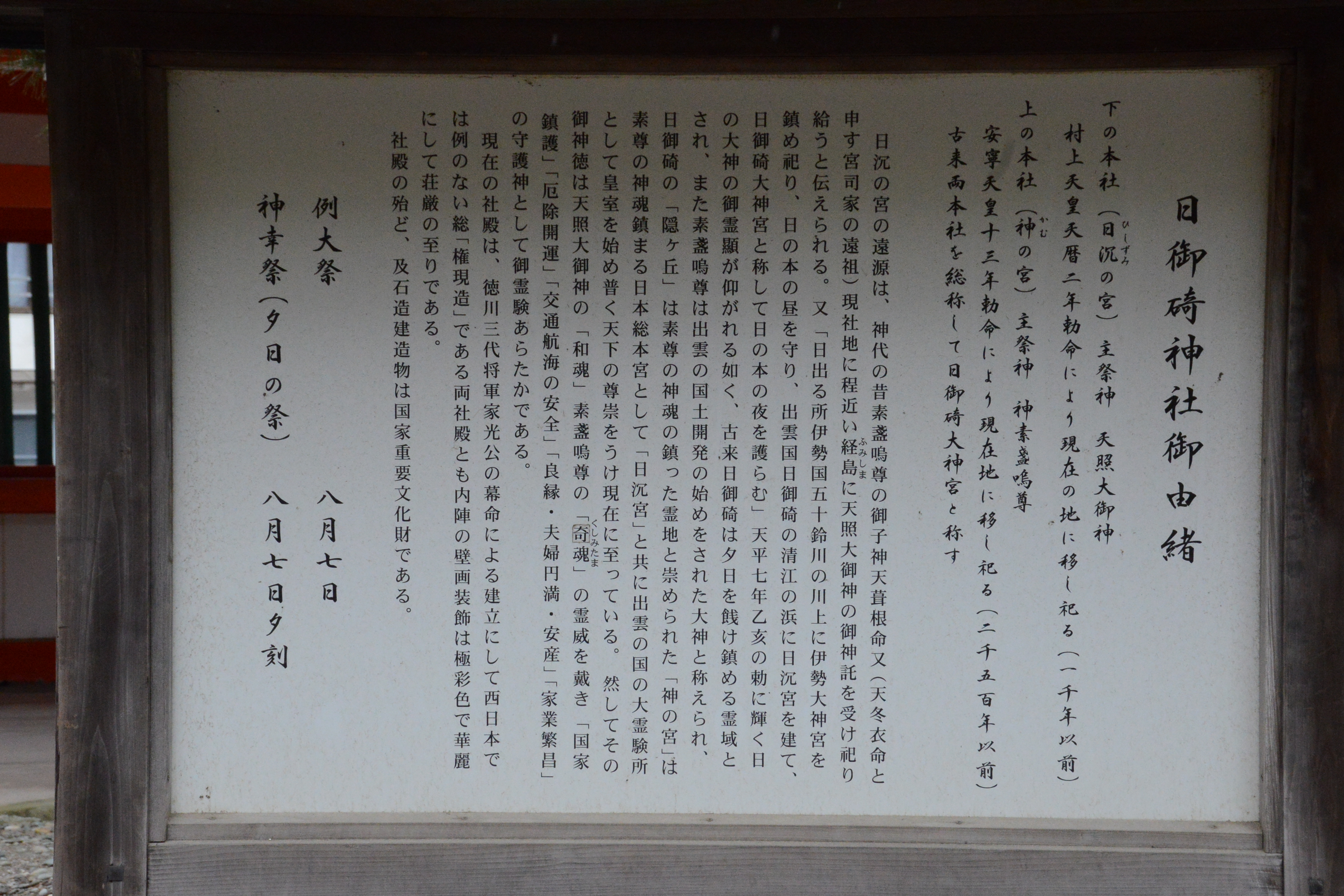 奈良時代の天平7年(735年)の天皇の命令としての勅に、『出雲国日御碕清江の浜に日沈の宮を建て日御碕大神宮と称して日の本の夜を譲る』とあらわされています。天照大神を祀る『下の宮』と素戔嗚尊(すさのおのみこと)を祀る『上の宮』とからなり、下の...