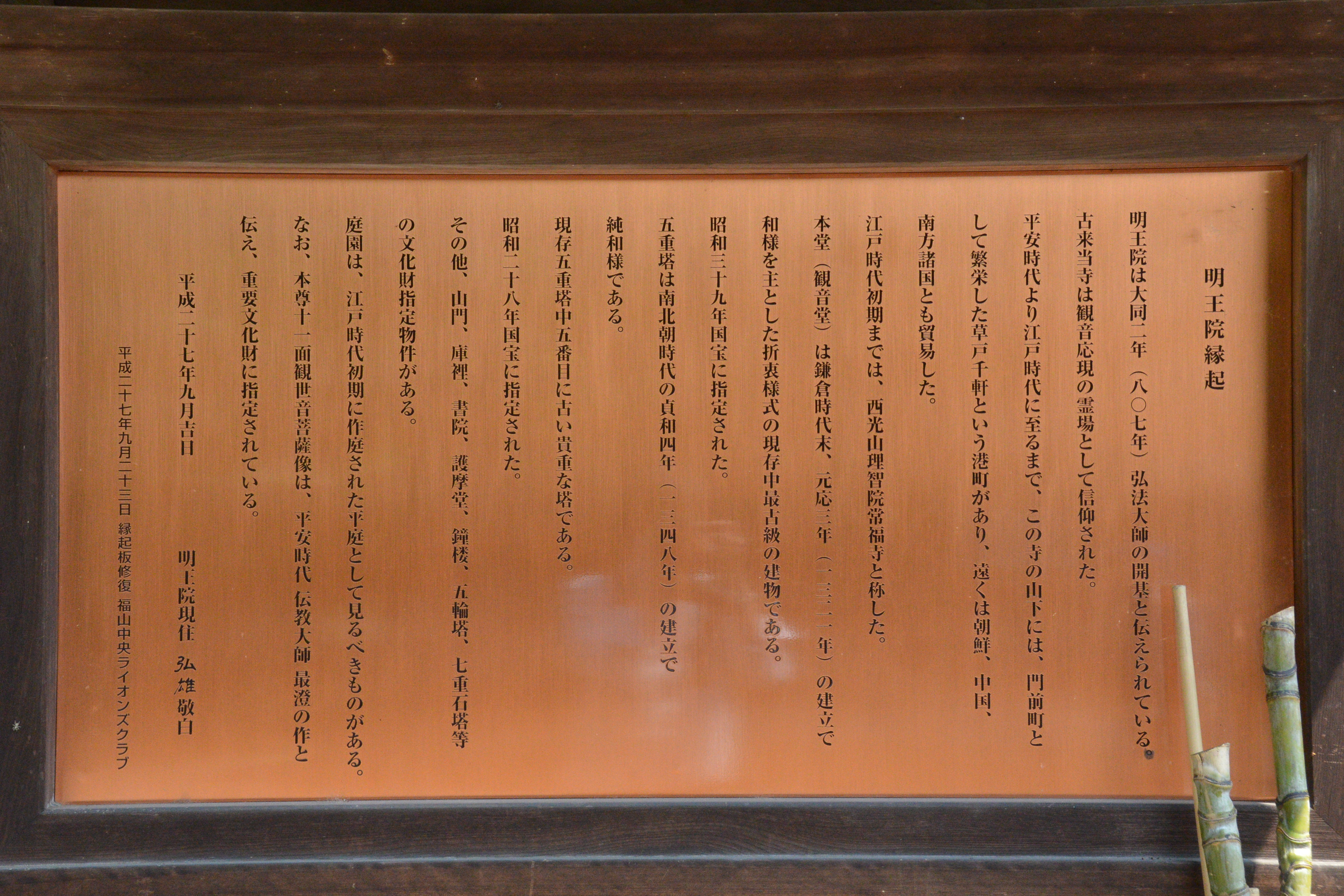 「庶民が建てた国宝」と言われる明王院は、大同2年(807年)弘法大師の開基と伝えられ、鎌倉時代に諸堂宇が建ち並び、江戸時代には水野氏の崇敬を受けて栄えたと伝えられています。 「庶民が建てた国宝」と言われる所以として、衆の信仰を大いに集めて...