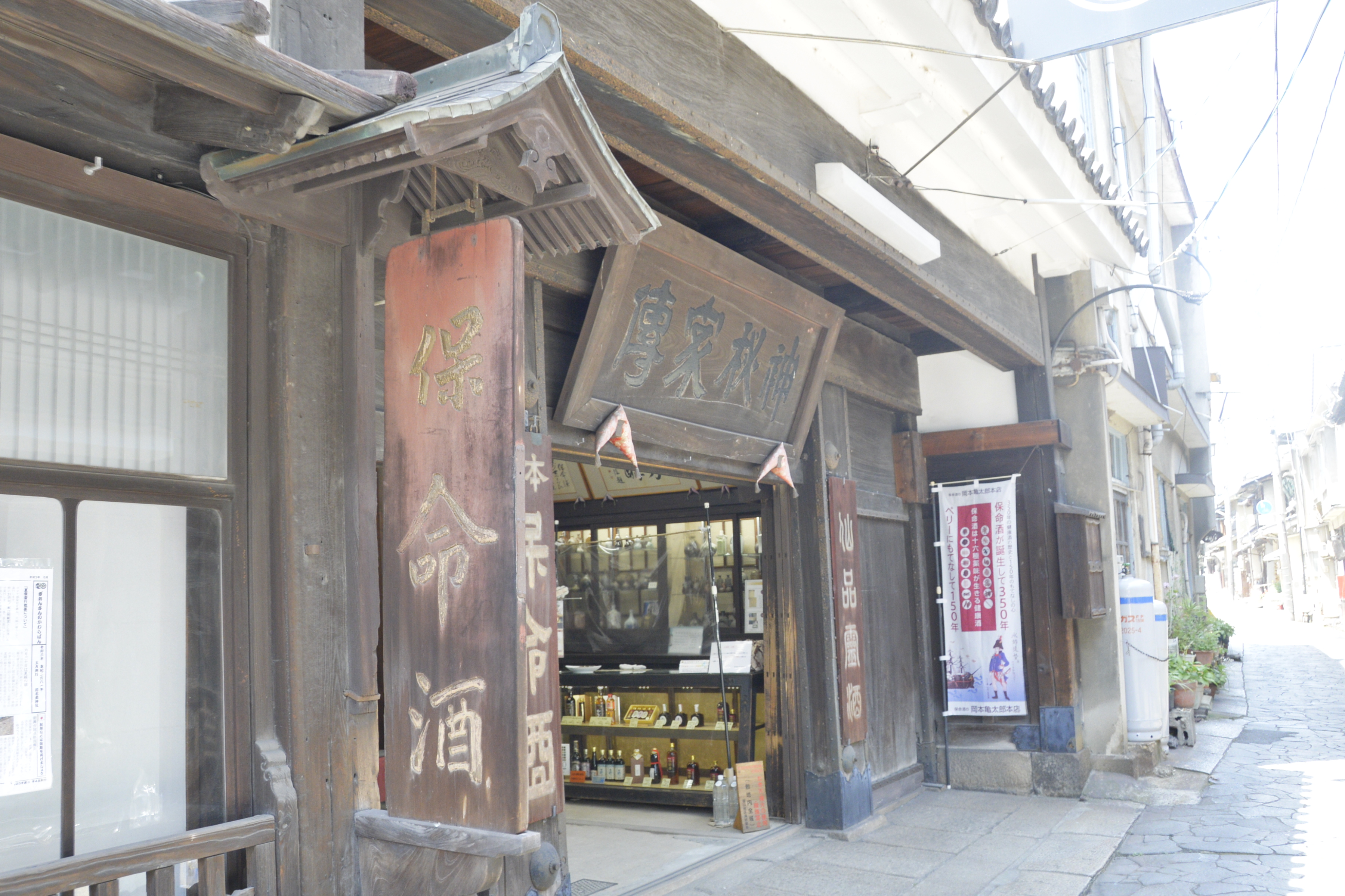 を復興させたとされています。もともと両側に番所を有していた造りでしたが、現在は左側のみとなっており、福山市の重要文化財に指定されている江戸時代初期の福山城郭内の遺構として貴重なものとされています。 また、岡本家は安政2年(1855年)に清酒業を始め、明治にはいって保命酒が元祖・中村家の専売でなくなると、当時中村家と懇意にしていた岡本亀太郎が醸造器材を中村家より譲り受けて保命酒業を始めたとされ、現在4軒残っている保命酒製造業者のひとつとなっています。