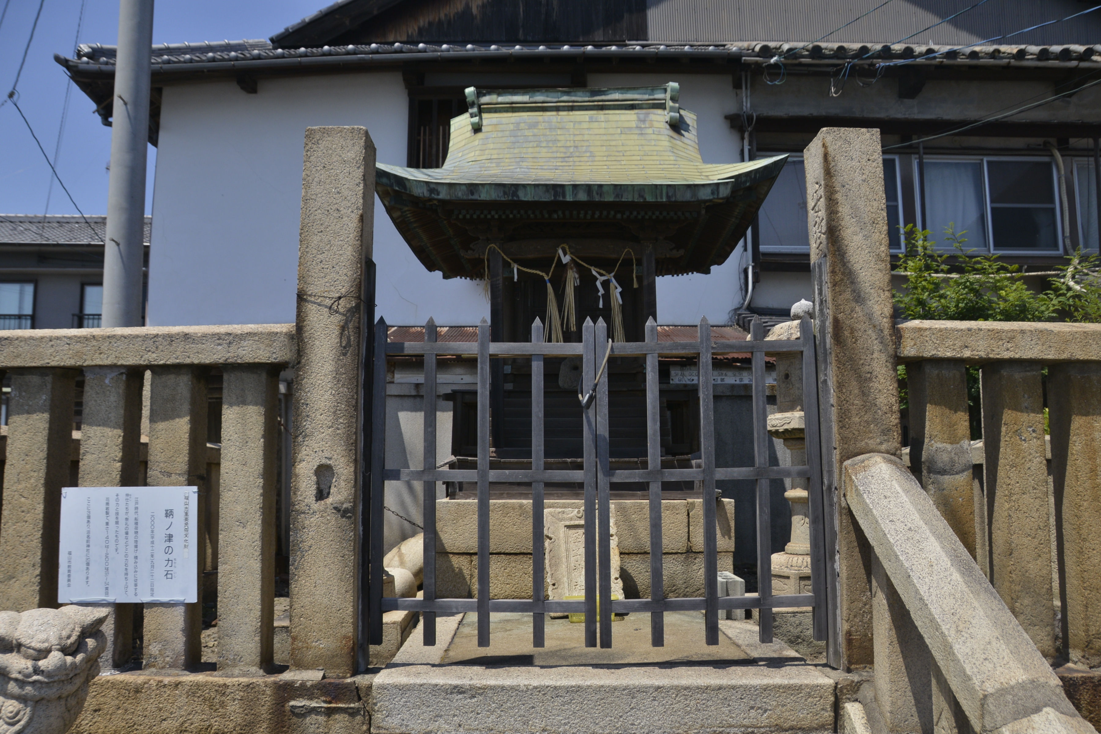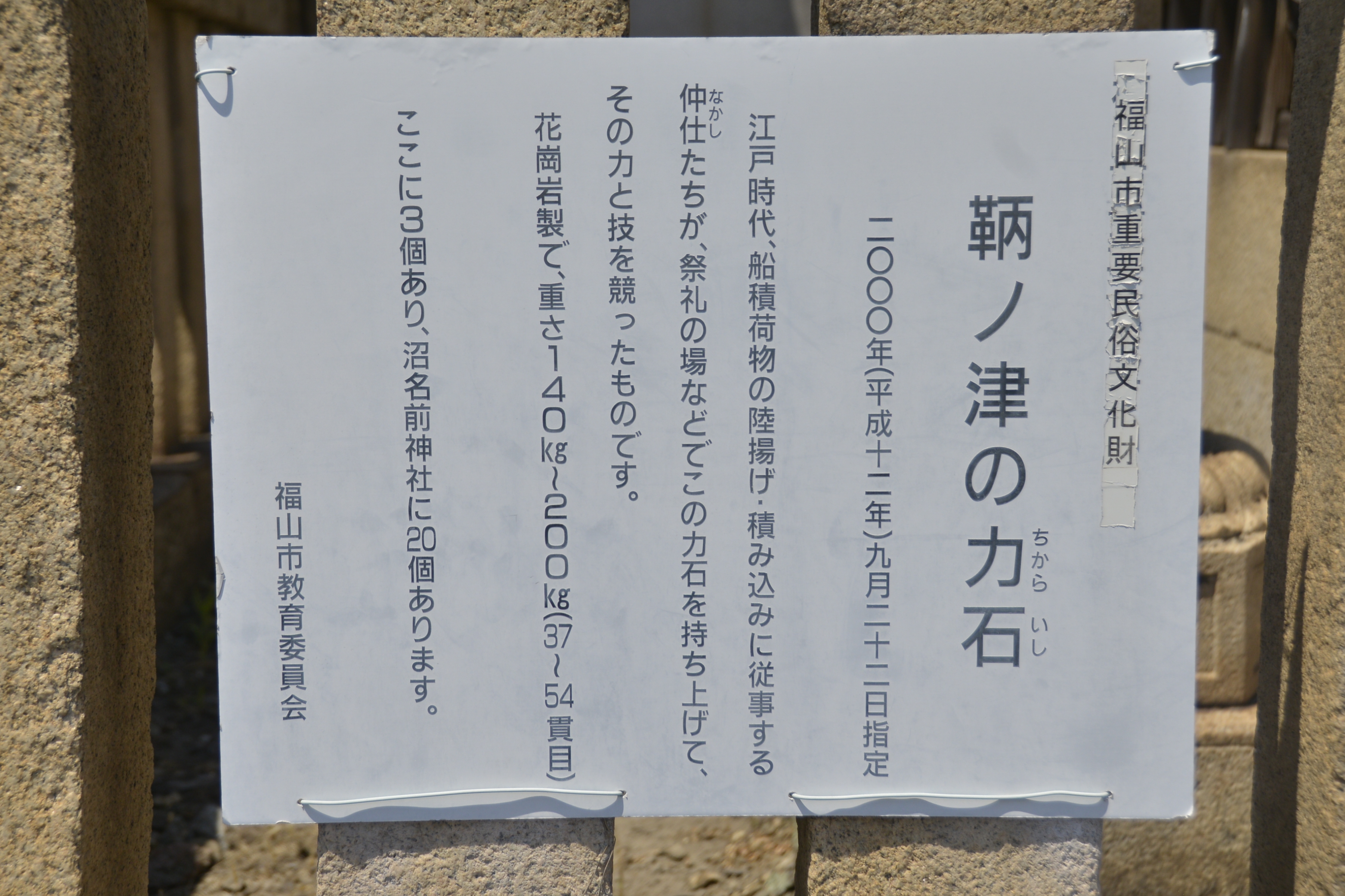 創建は不詳で、現在の社は鞆の名士、林家が建立したとされており、江戸時代に船の荷揚げをしていた仲仕が、祭りなどでその力自慢を競い合った3つの力石が奉納されています。