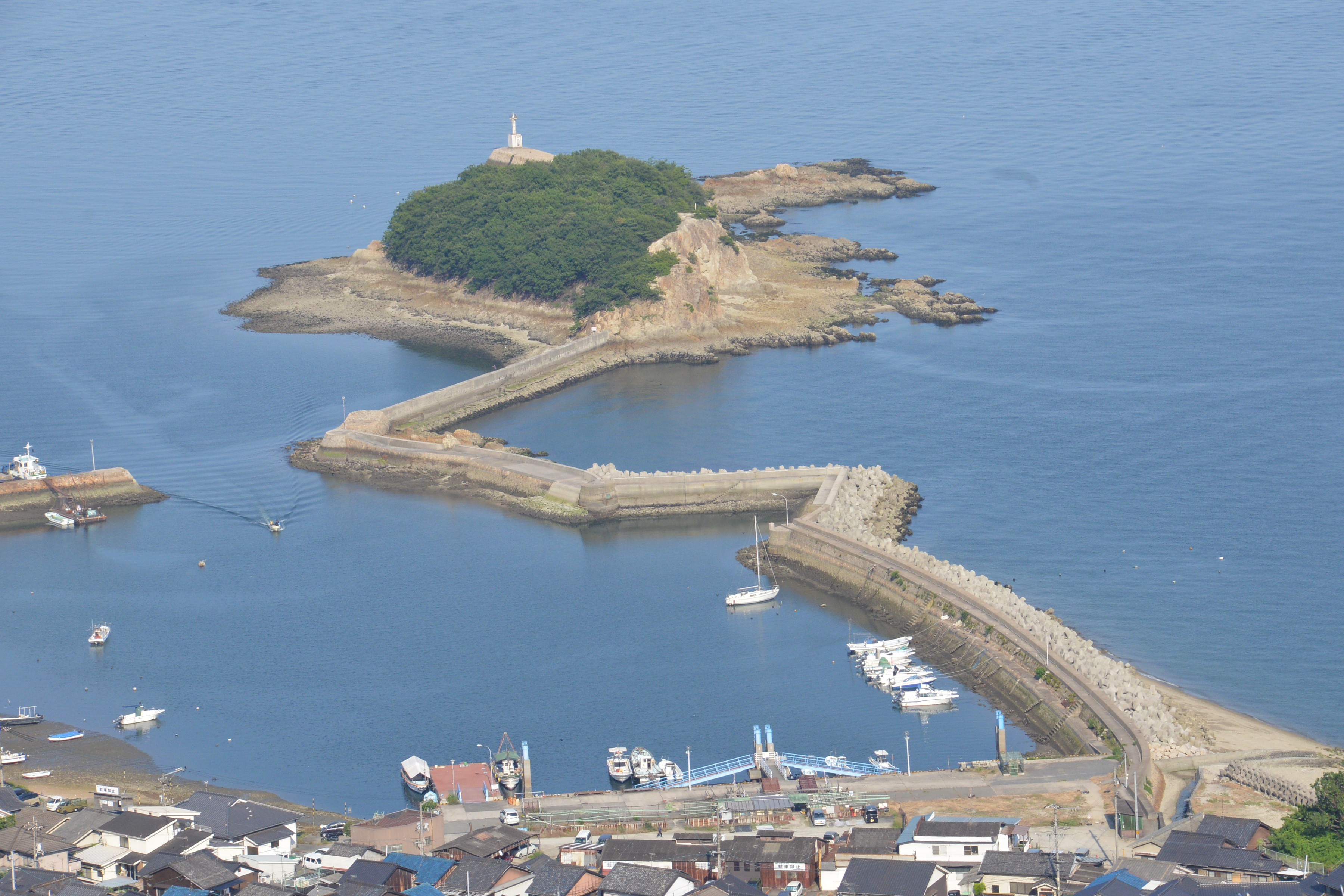 1805年)に島の頂上に玉津島明神を祀ったところから、「玉津島」に改名されたといわれています。弘化4年(1847年)に146mの波止が造られたが、その後に波の影響を受けやすいとの理由で、防波堤を島まで延ばし陸続きにしたとされています。地元では、ねずみが寝ている姿に似ていることから「ねずみ島」とも呼ばれています。