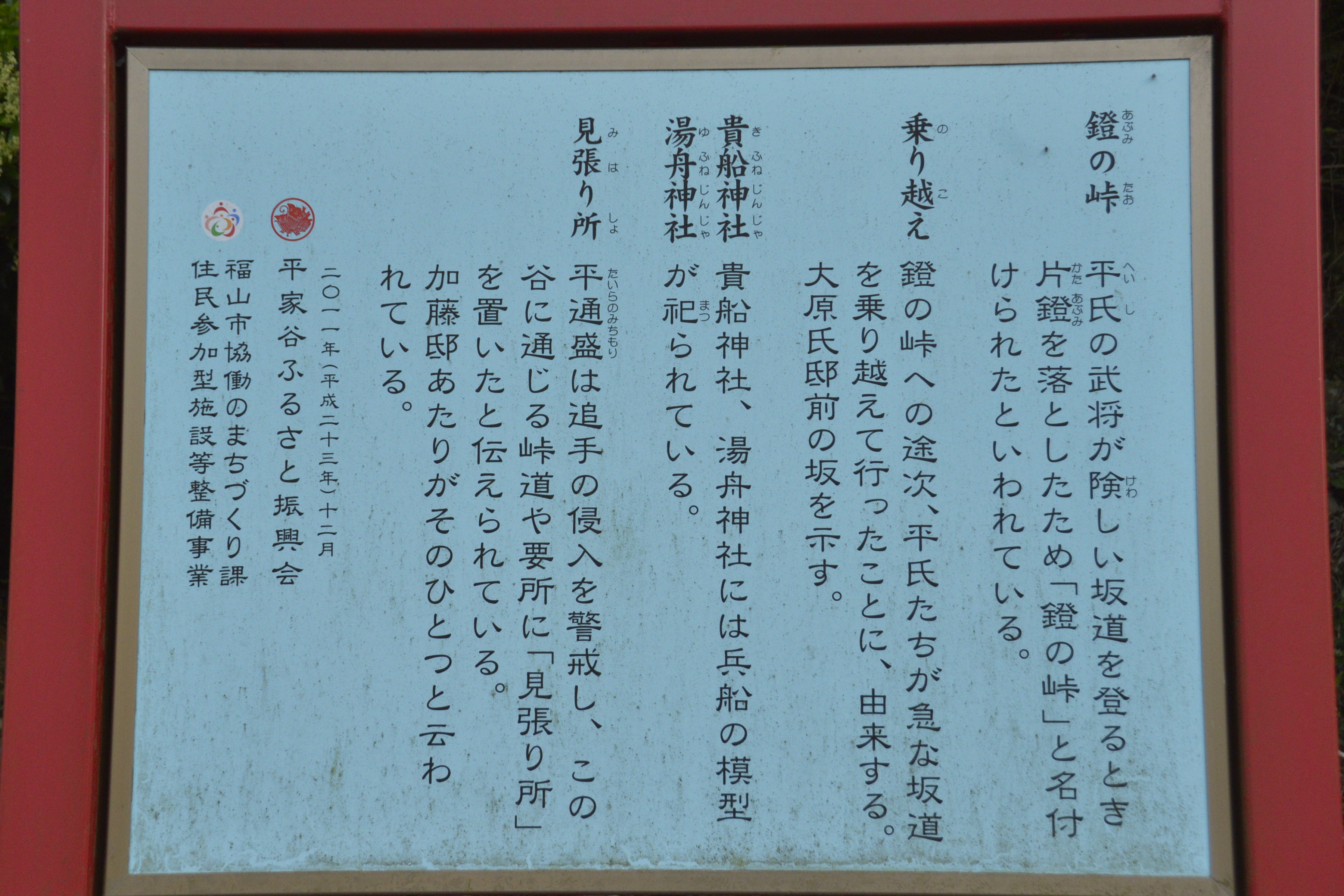 の里と言われ、平家の武将が鐙(あぶみ)を落としたという鐙峠(あぶみとうげ)や、一行が八日間ひそんだという八日谷、武将が大岩めがけ「わが武運いかに」と刀で切りつけ刀の形を残していたとされる刀岩、乗越(のりこし)、的場(まとば)、弓場(ゆみば)などの地名に、当時を偲ぶことができ、平清盛の甥の通盛(みちもり)とその妻小宰相(こさいしょう)を祀った通盛神社、平家を象徴する赤い旗が祀られている赤幡神社など平家ゆかりの遺跡が多く残っており、平家にまつわる伝説が語り継がれています。