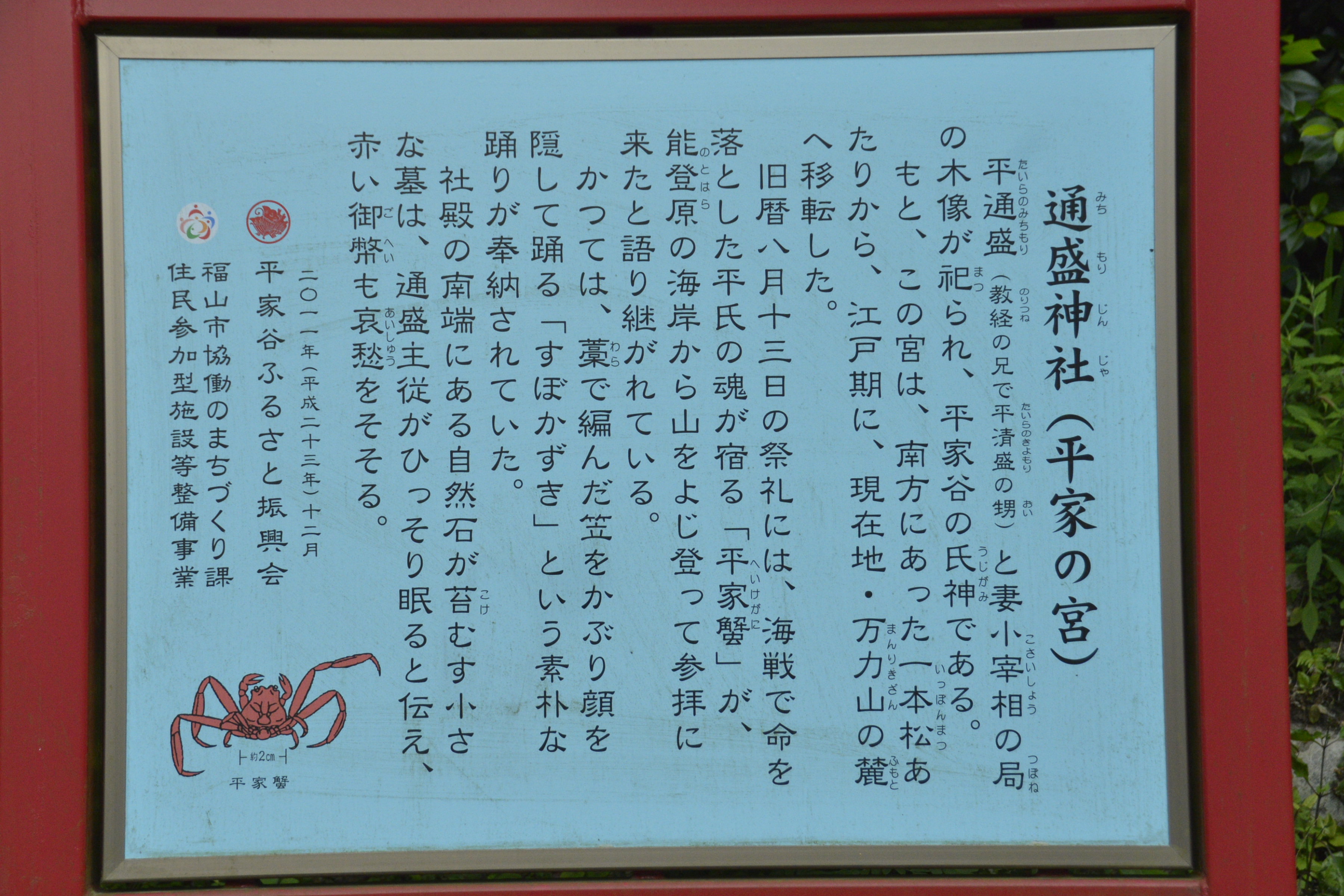 立されていましたが、度重なる水害を避けるために、江戸時代の初めに現在の地に遷宮され、現在の御殿は明治33年(1900年)に建て替えられたものとなり、境内には主従のお墓、通盛の五輪塔などがあり、手水舎の手水石の紋は平家伝統の揚羽蝶が付けられています。また、この谷の人々は平家の子孫といわれ、毎年旧暦8月13日に開催されるこの神社に伝承される祭りには、海戦で命を落とした平氏の魂が宿るとされた「平家蟹」が能登原の山をよじ登り参拝に来たという話が語り継がれており、戦った源氏側の足利義満公も 「よるべなき 身は今蟹と生れきて 波の哀れに しづむ墓なき」 と詠んでいます。 神社の先には、平通盛がしょうぶ湯につかったという言い伝えにちなんで整備された『平家谷花しょうぶ園』があり、6月上旬~6月下旬に約300種類・約48,000本の花しょうぶが谷あいを染め、3月中旬~4月下旬には、その側にある『平家谷つばき園』では約400種・約500本のツバキが咲き誇ります。